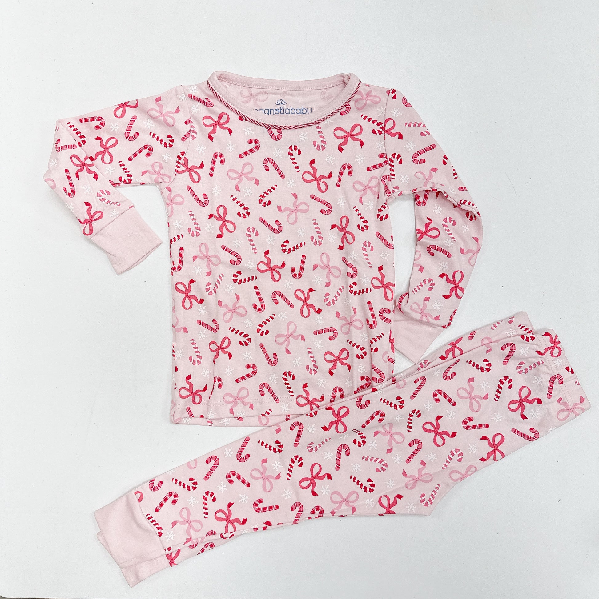 This classic long pajama set is a perfect choice for the holiday season. Made from luxurious Pima Cotton, it features a charming all-over print of candy canes and bows and delicate red picot trim. The two-piece set ensures your little one stays comfortable and cozy all night long, while the timeless style makes it perfect for creating lasting memories.
