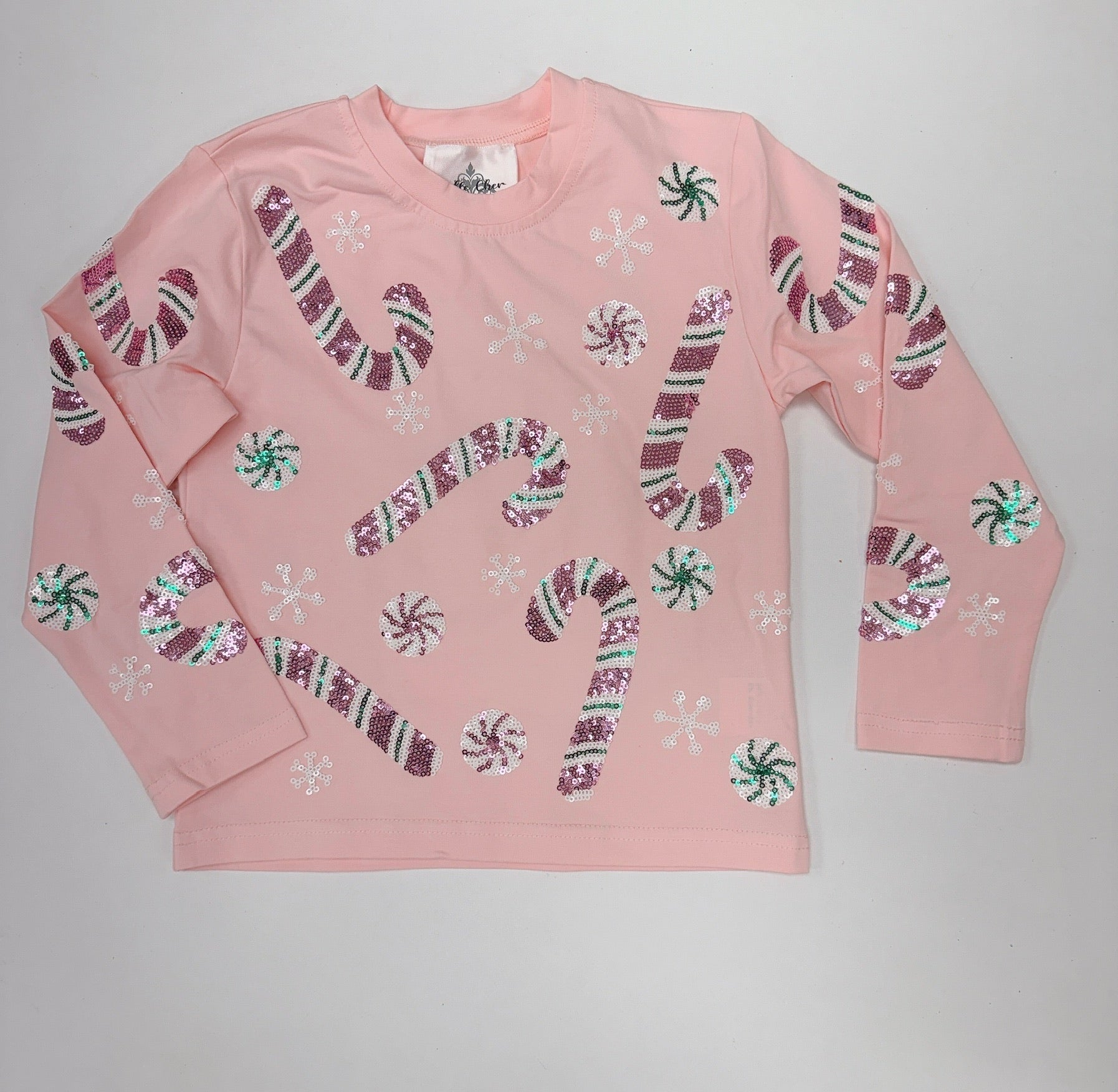 A pink shirt with a sequin candy canes for girls made by Belle Cher.