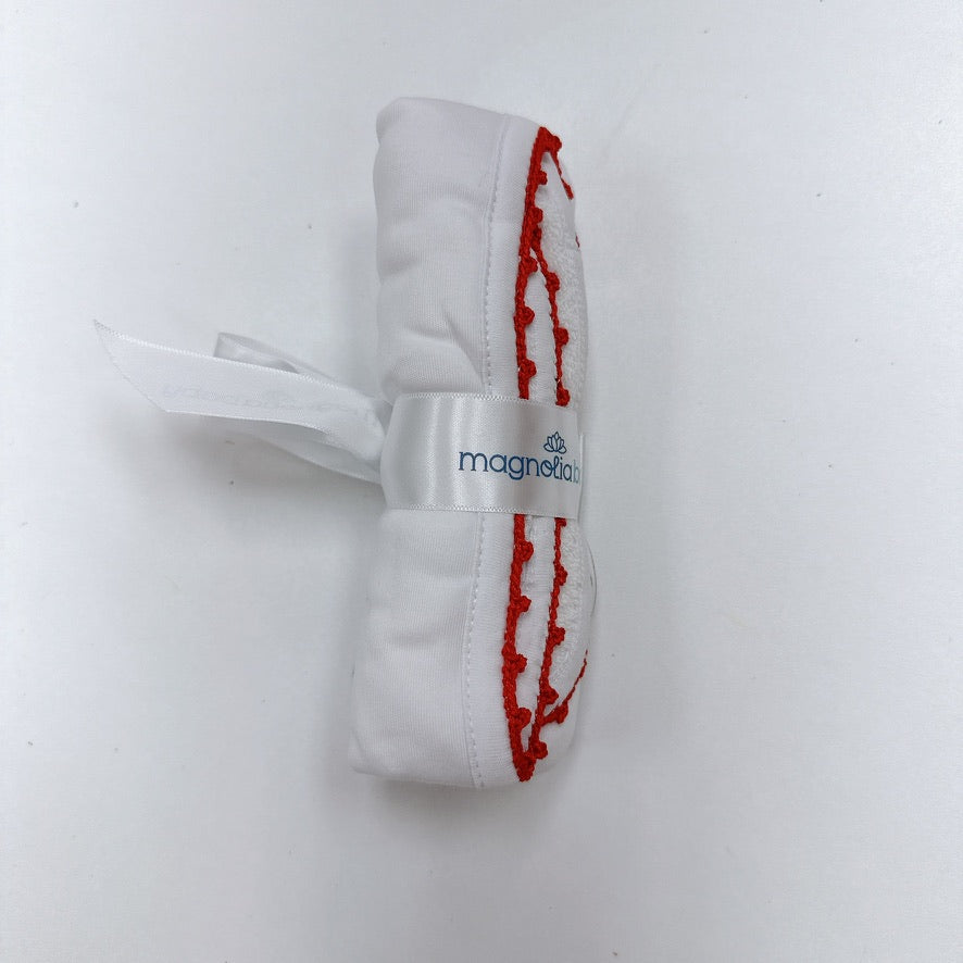 Keep clean with classic elegance using this essential burp cloth. Crafted from luxurious Pima Cotton, this soft white burp cloth features delicate red handmade crochet trim along its edges, a hallmark of this cherished collection. As a beloved classic, this burp cloth is perfect for personalization, allowing for a unique monogram or embroidery to create a truly special keepsake. Its generous size and absorbent terry cloth backing make it a practical and beautiful accessory.