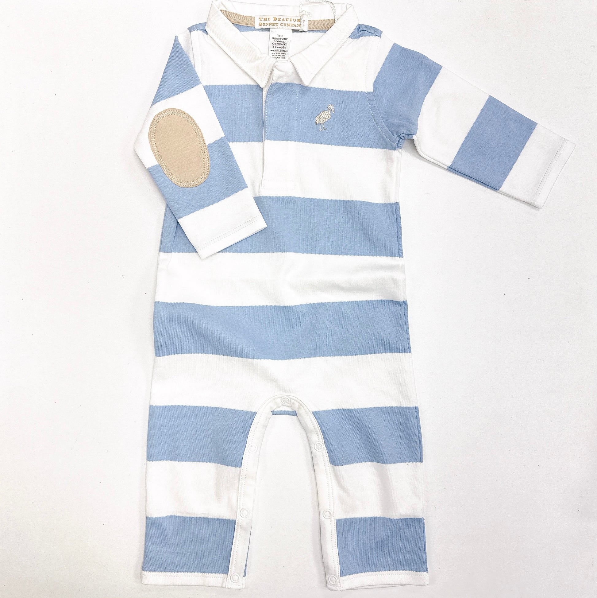 Your little gent will love our Sir Proper's Rugby Romper! Featuring Barrington Blue Stripe with Keeneland Khaki Stork, he'll be playing in style all season long.