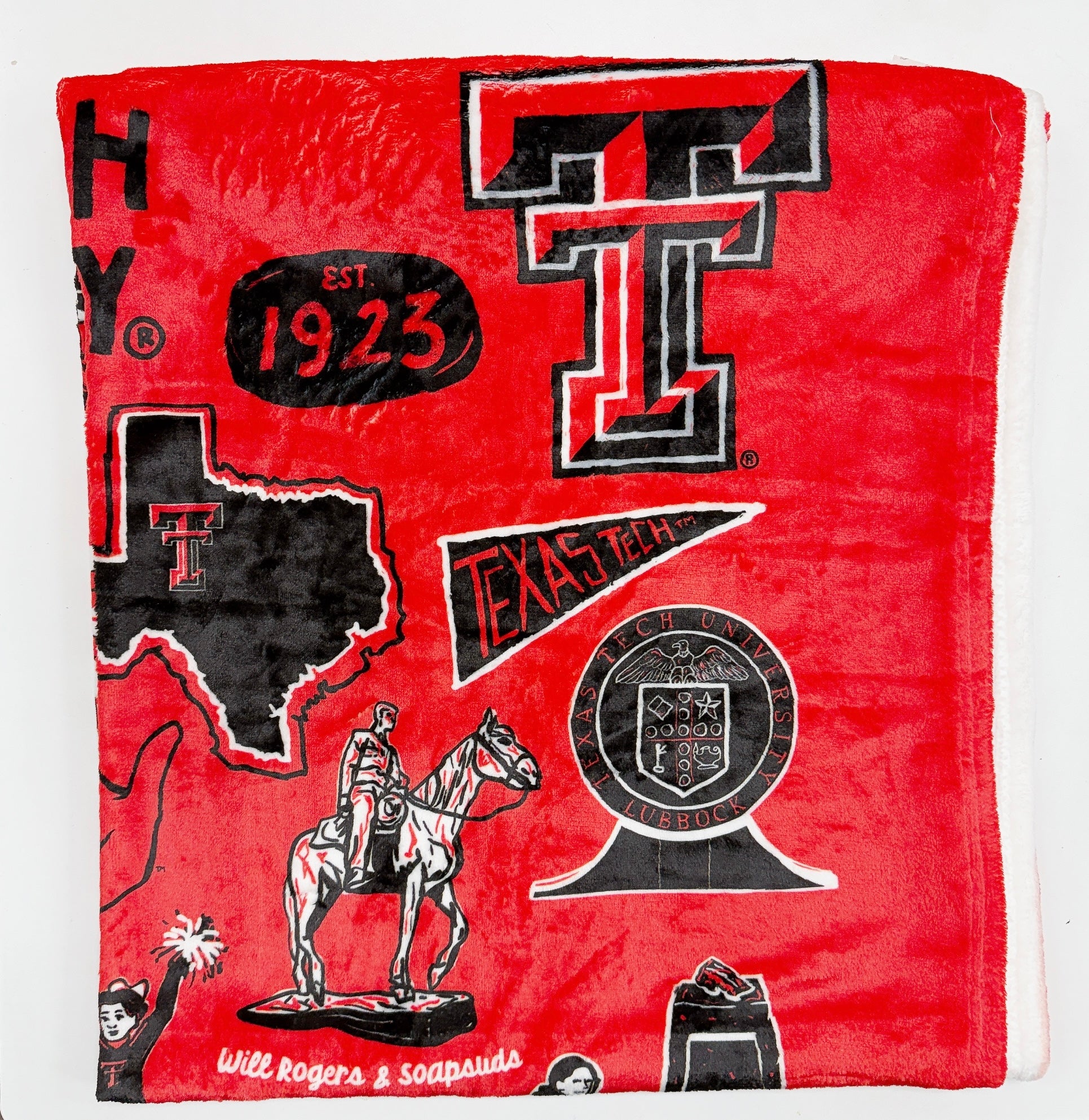 Texas Tech Vive La Fete Impressions hand sketched artwork soft light weight fleece throw. Officially Licensed product sold by Vive La Fete. Soft and snuggly. Blanket measures 40” x 58”.