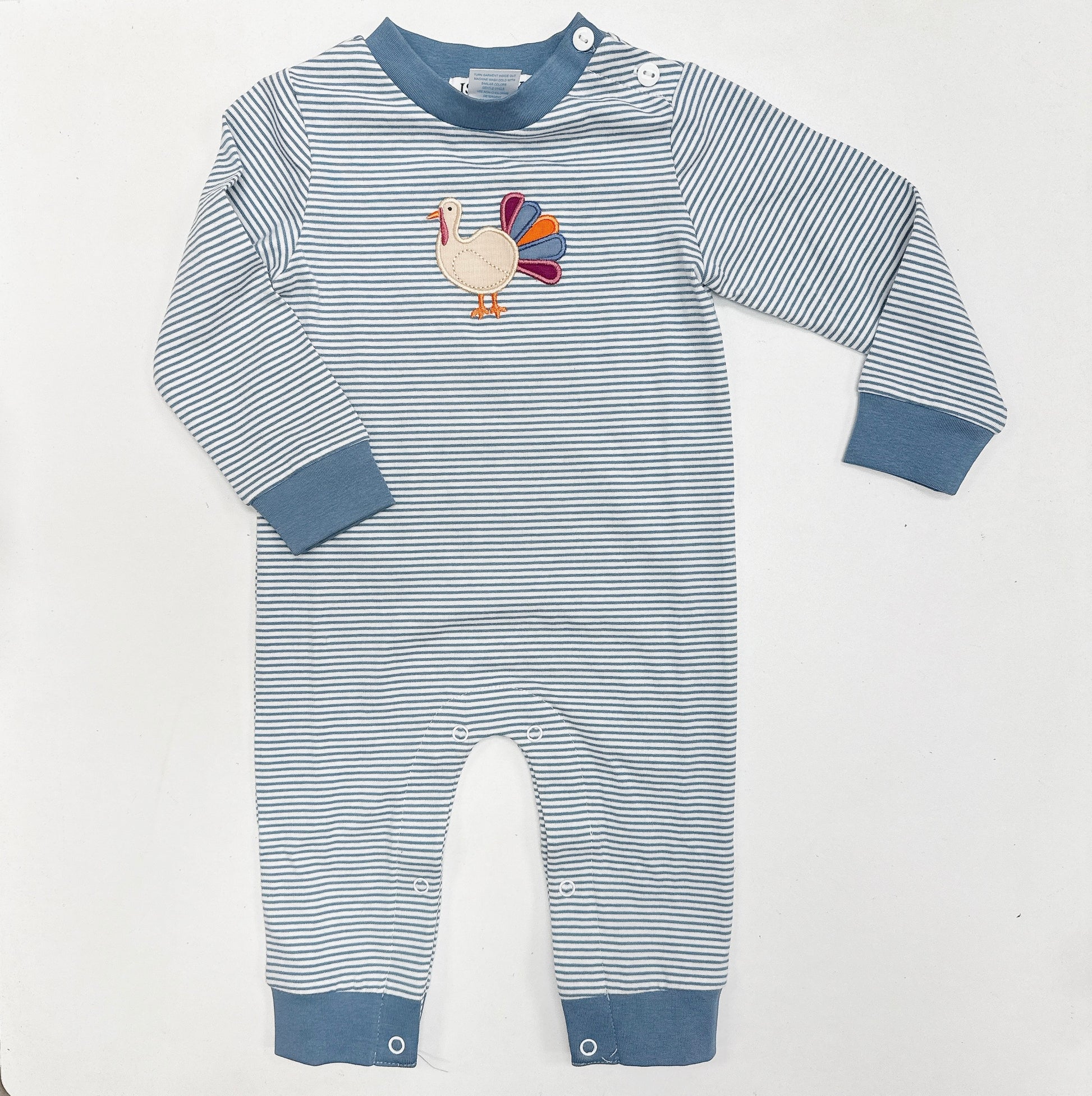 This long-sleeved romper features classic blue and white stripes, complemented by a charming turkey applique that adds a playful touch to any autumn celebration. The soft, stretchy fabric ensures your little boy stays comfortable whether he's playing in the leaves or attending a family gathering.
